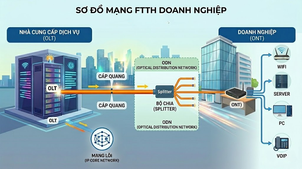 Trên đường đi từ nhà mạng đến doanh nghiệp, một sợi cáp quang chính có thể được chia nhỏ ra để phục vụ nhiều khách hàng khác nhau. Nhiệm vụ này do mạng ODN và các Bộ chia quang (Splitter) thụ động đảm nhận. Điểm đặc biệt là Splitter không cần sử dụng điện năng, giúp giảm thiểu rủi ro chập cháy và tiết kiệm chi phí bảo trì.