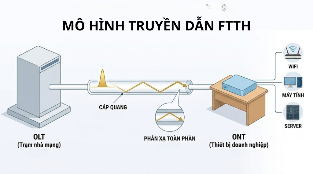 Các chùm ánh sáng này được bắn vào lõi sợi cáp quang. Nhờ lớp vỏ phản xạ bọc bên ngoài lõi, ánh sáng không bị rò rỉ ra ngoài mà liên tục phản xạ zig-zag dọc theo chiều dài sợi cáp, tiến thẳng đến thiết bị ONT tại văn phòng bạn với tốc độ xấp xỉ 300.000 km/s. Tại đây, ONT sẽ giải mã ánh sáng ngược lại thành dữ liệu số để máy tính của bạn có thể đọc được. Quá trình này diễn ra hai chiều (Upload và Download) gần như ngay lập tức.
