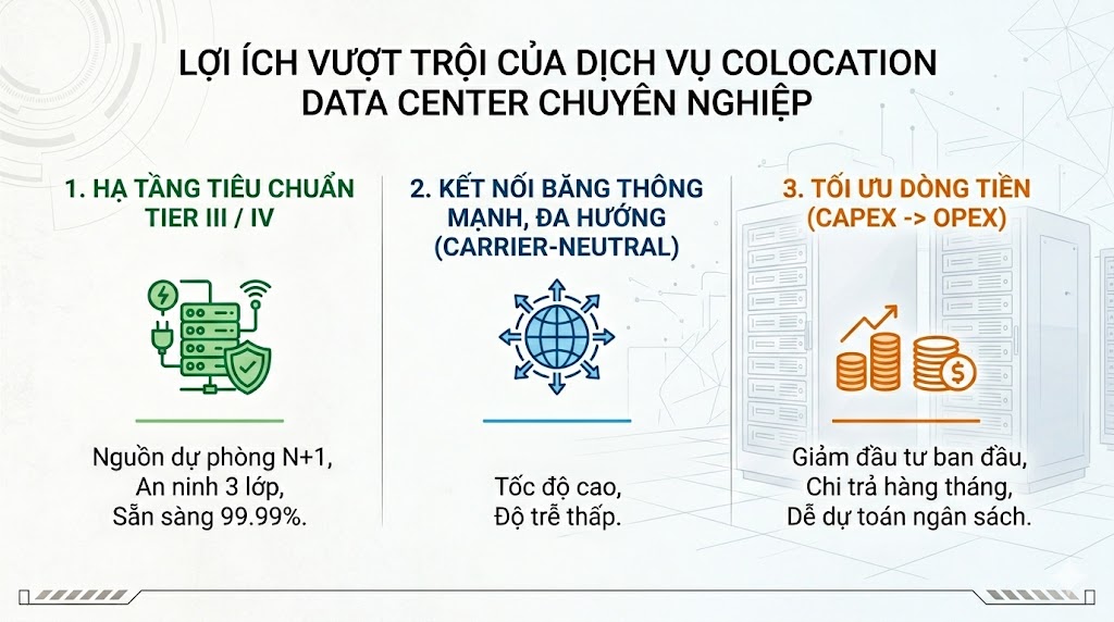 Thay vì tự gồng gánh hạ tầng, việc sử dụng dịch vụ Colocation mang lại những lợi ích vượt trội:
